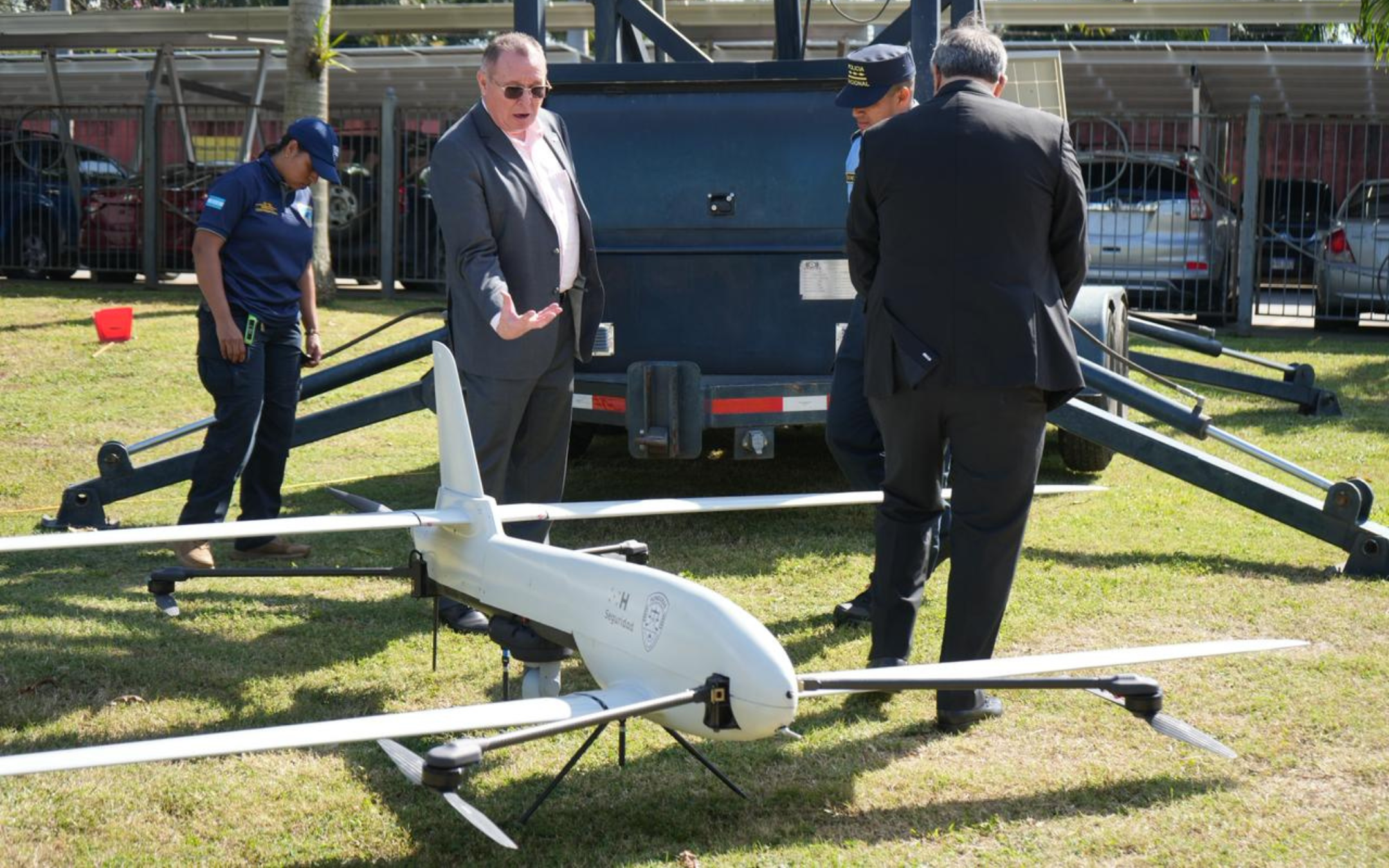 Durante la presentación, se observaron aeronaves no tripuladas de distintas capacidades. Entre ellas se identificaron al menos dos DJI Mini 3, dos DJI Mavic 4 Pro y un DJI Mavic 3 Pro. Además, se exhibieron dos drones de mayor envergadura, destinados al patrullaje constante.